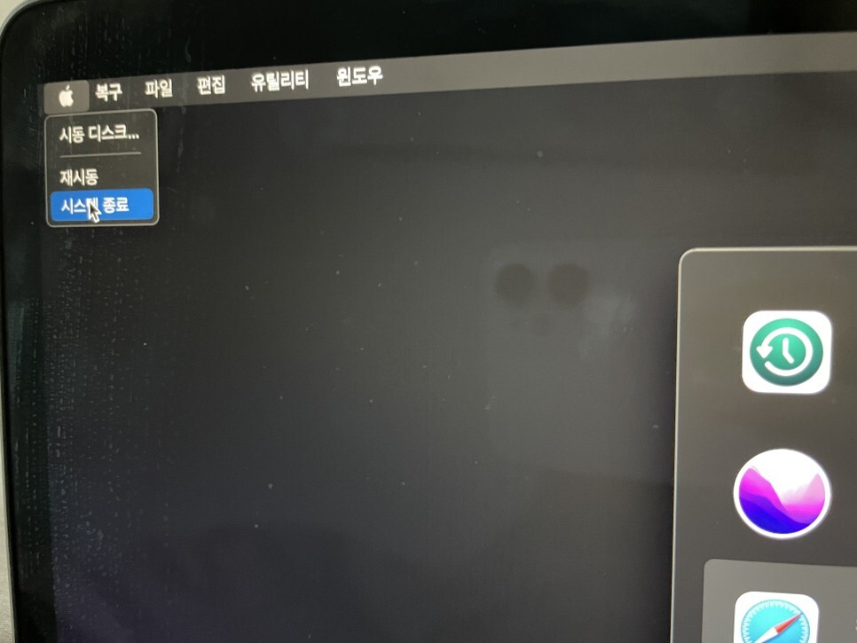 위 화면이 뜬 상태에서 아무것도 선택하지 않고, 좌상단 메뉴를 통해 시스템 종료를 해준 후 다시 켠다.