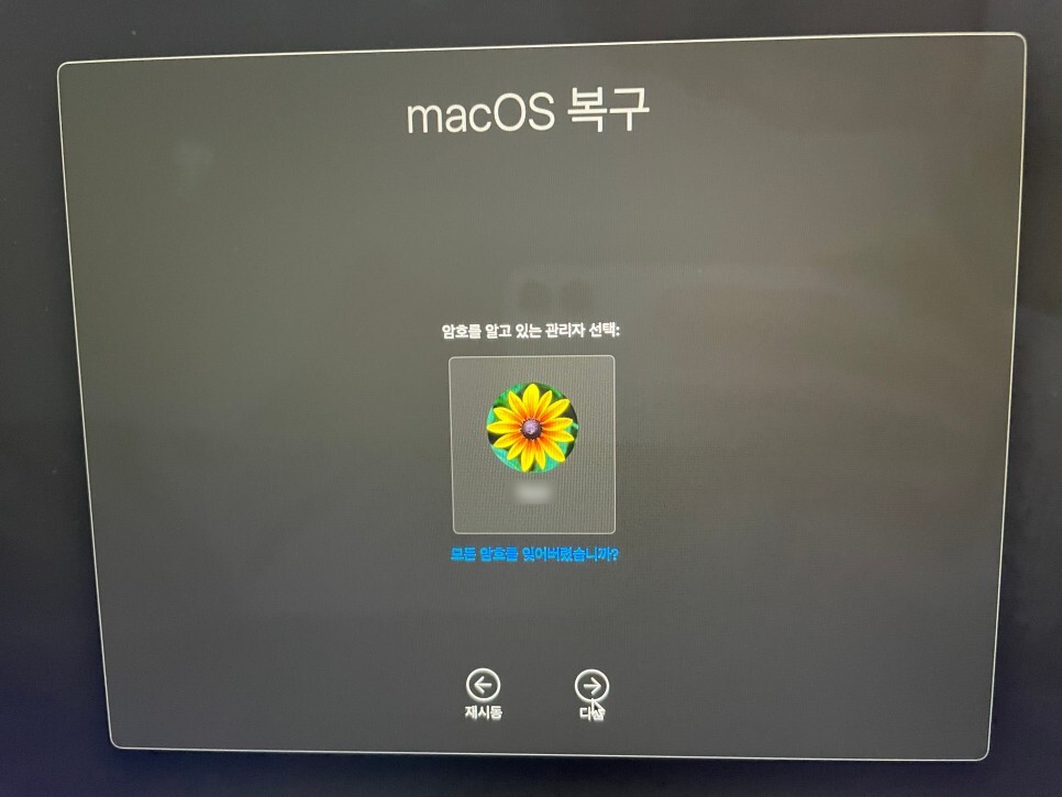 그럼 macOS 복구 화면이 뜨는데, 여기서 나는 암호를 변경한 적이 없으므로 바로 다음을 눌러줬다.